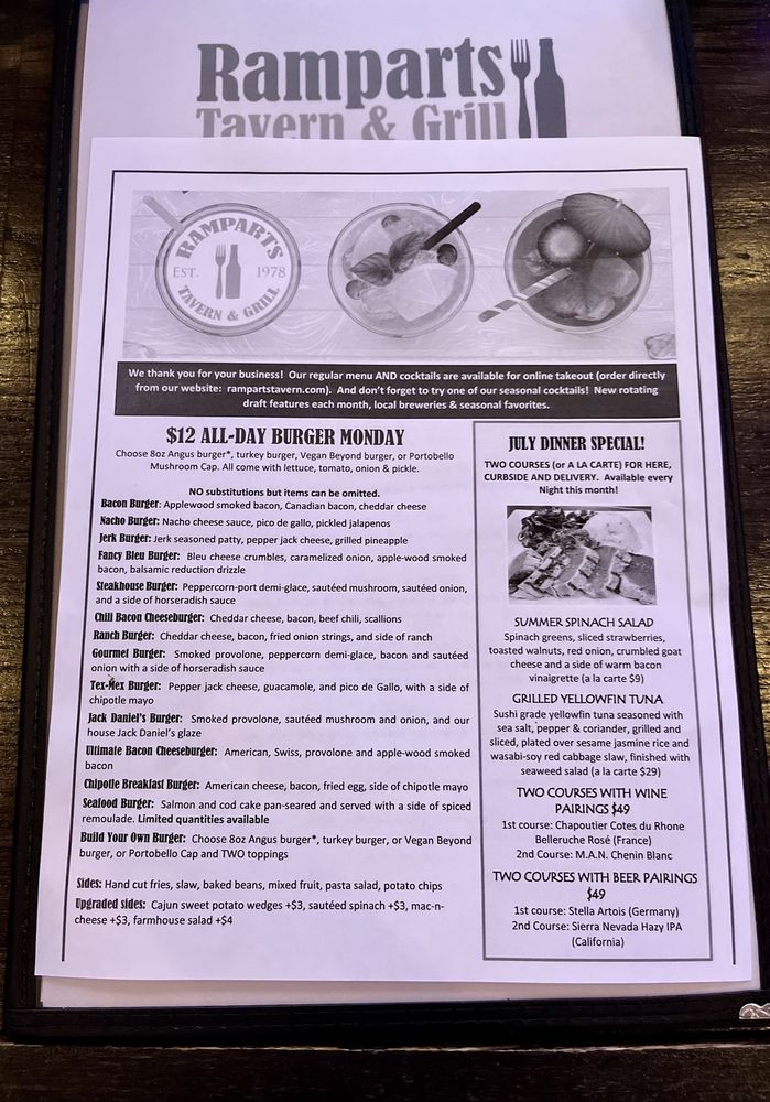 Introducing Ramparts, a classic American restaurant located in Alexandria, VA. With a cozy neighborhood feel, Ramparts offers a variety of dishes for all tastes. Try the Blackened Sesame Shrimp & Greens Salad for a refreshing option or indulge in the Grilled Brie appetizer for a savory treat. The menu also includes comforting options like Chili Nachos and Mushroom Ravioli. Customers rave about the friendly atmosphere and attentive service, making dining at Ramparts a pleasant experience. Don't miss out on the happy hour specials and diverse selection of drinks at the full bar. Whether you're looking for a quick bite or a leisurely dinner, Ramparts is sure to please. Visit Ramparts for a taste of local American cuisine done right.